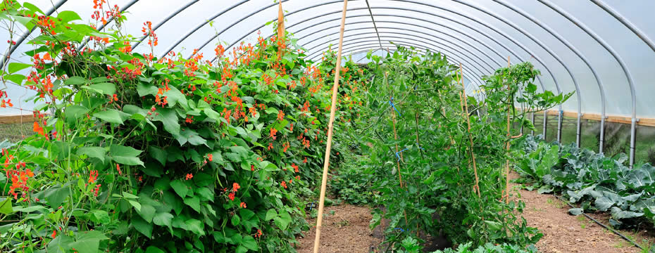 Beans growing in a polytunnel